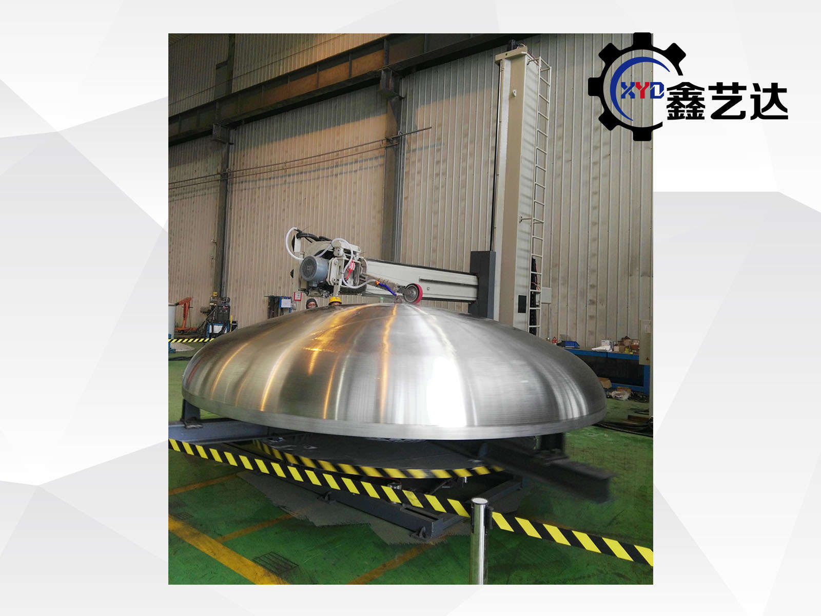 工件安裝在轉(zhuǎn)臺(tái)上旋轉(zhuǎn),立柱和橫梁用伺服控制橫梁水平,上下移動(dòng),通過數(shù)控程序控制,帶動(dòng)磨頭按照工件輪廓走軌跡,同時(shí)采用磨頭主軸伺服旋轉(zhuǎn)技術(shù),使磨頭更加符合工件曲線,大大提高了磨削效率和拋磨效果。