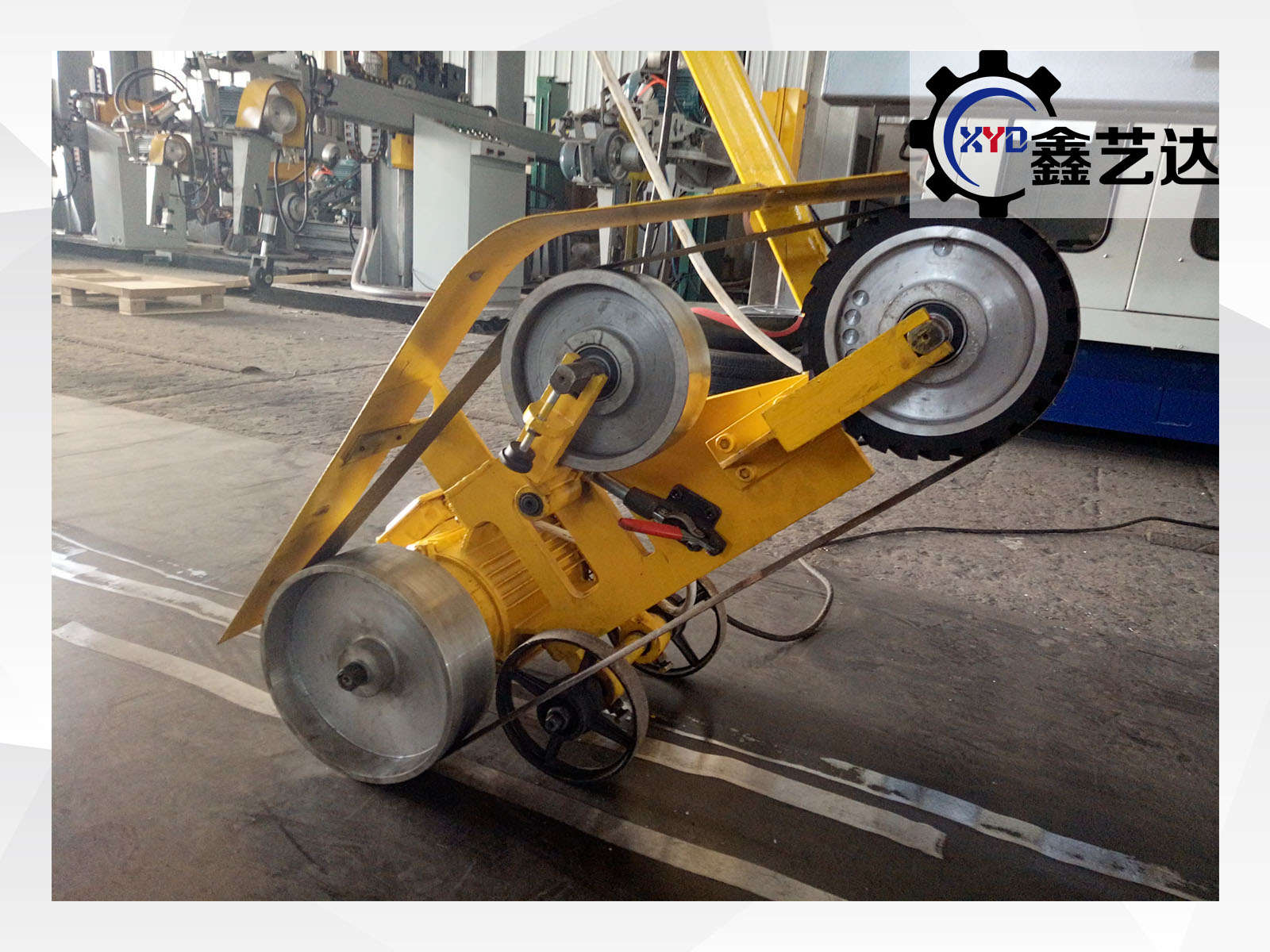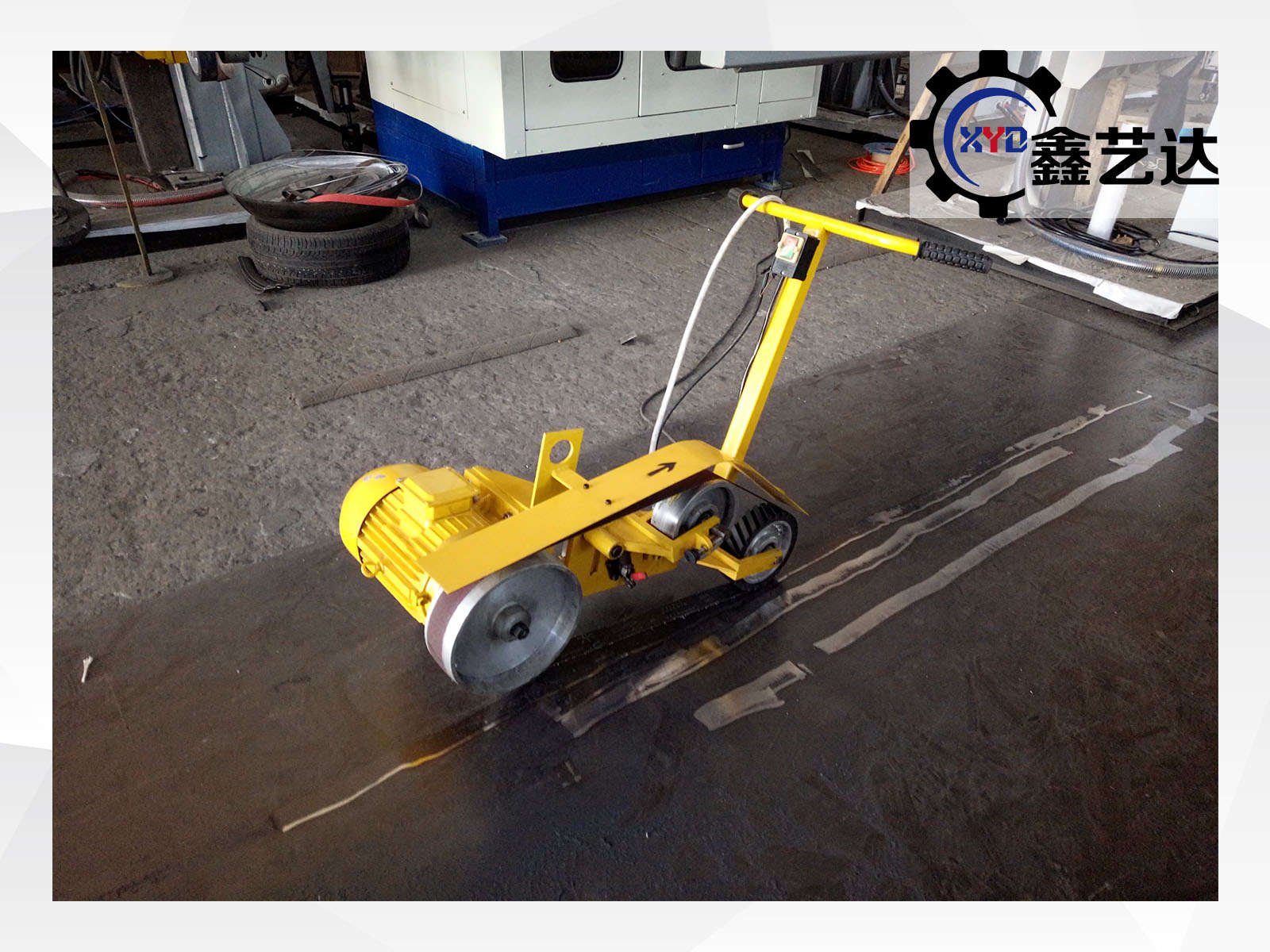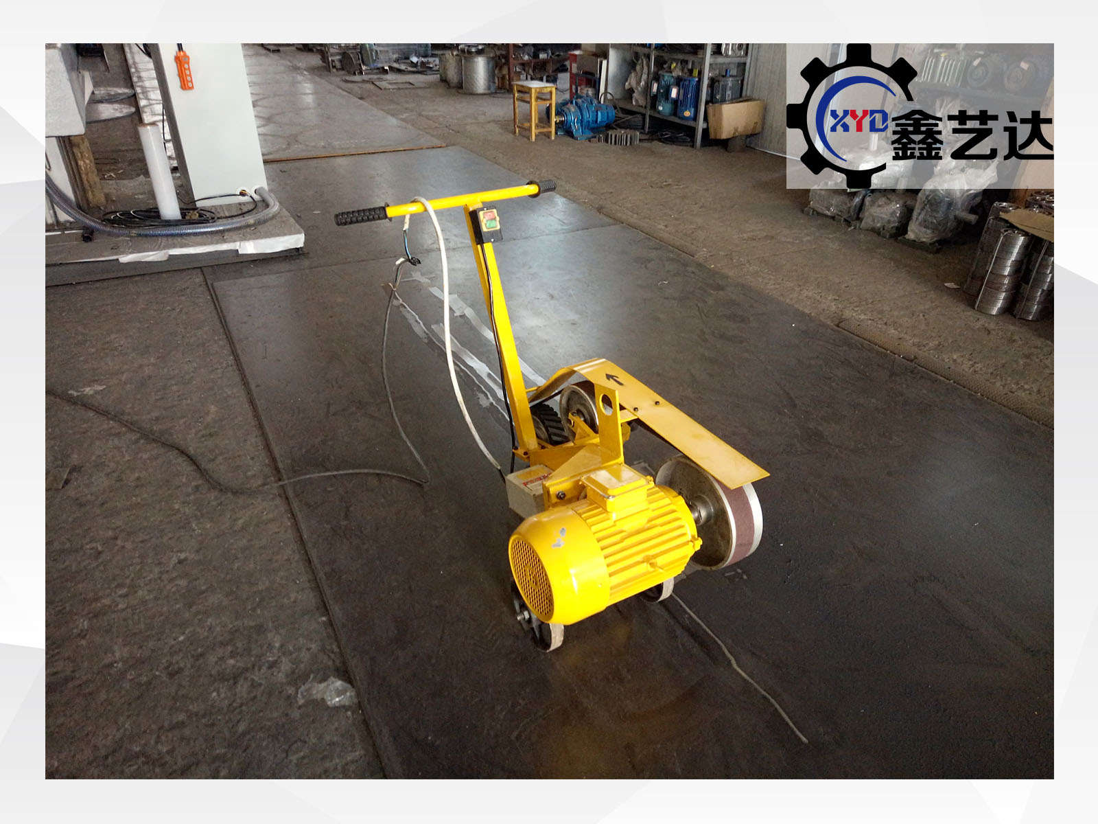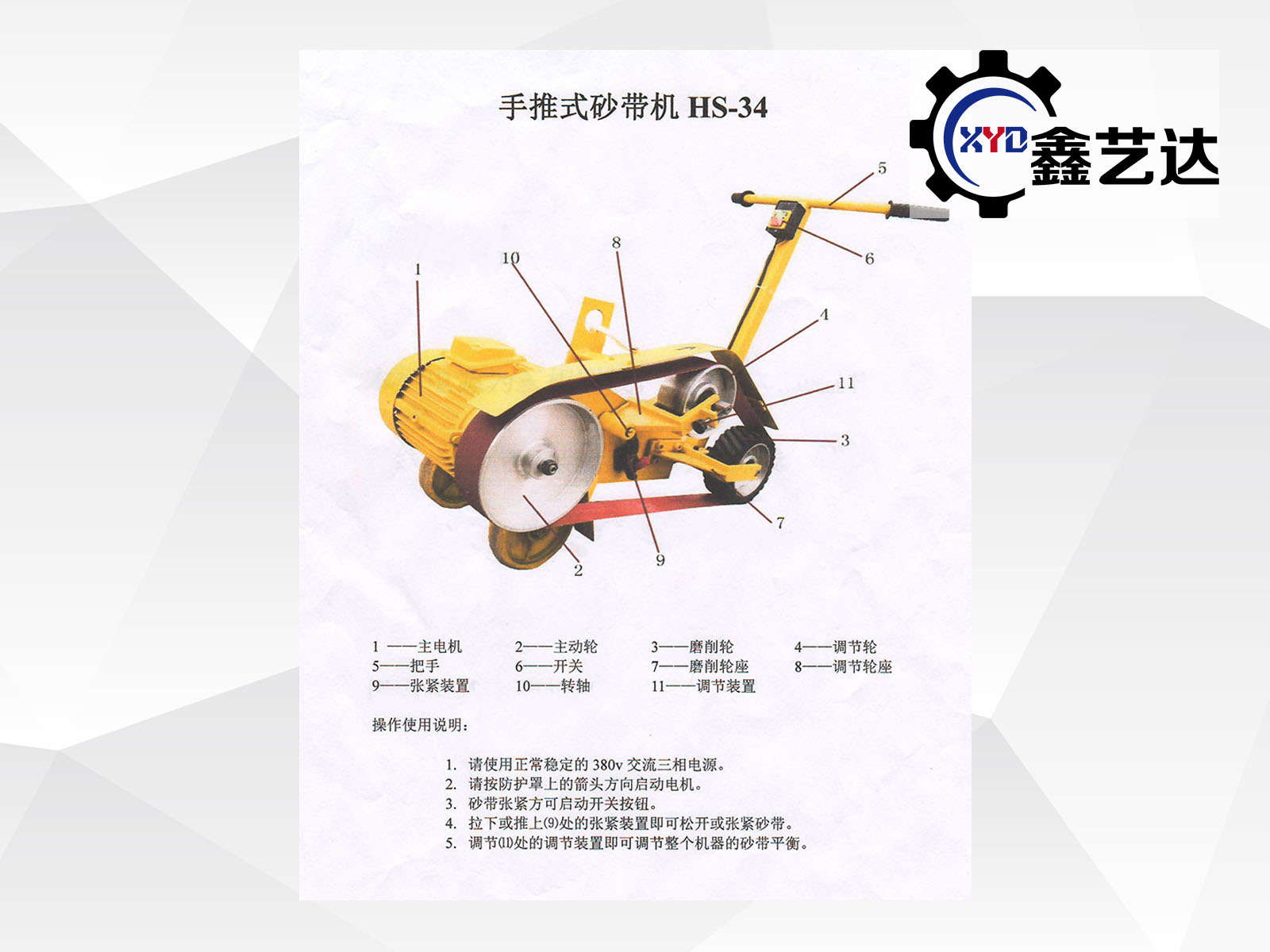 該機主要由砂帶驅動機構、接觸輪(磨輪)系、磨頭體、支座、支腳、腳輪、砂帶、手推桿及電氣控制系統(tǒng)等組成。電動機直接將動力傳遞給驅動輪,帶動砂帶高速旋轉,通過張緊機構張緊砂帶,用接觸輪進行磨削加工。