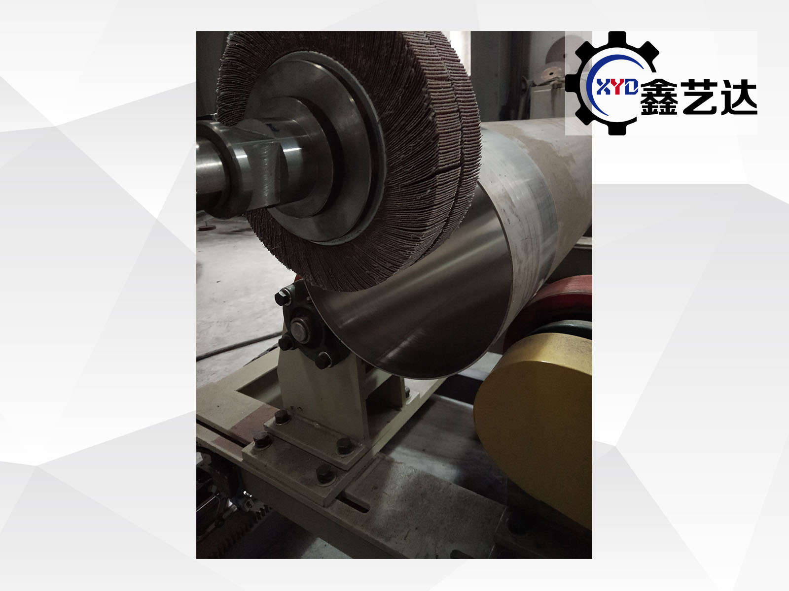 采用千葉輪或布輪、麻輪,橫梁上下點(diǎn)動調(diào)整磨頭位置、橫梁左右固定,設(shè)備底座行走,電機(jī)后置,橫梁內(nèi)聯(lián)軸器連接,后端有氣缸鉸鏈實(shí)現(xiàn)浮動,前段安裝磨頭的方式進(jìn)行拋光。